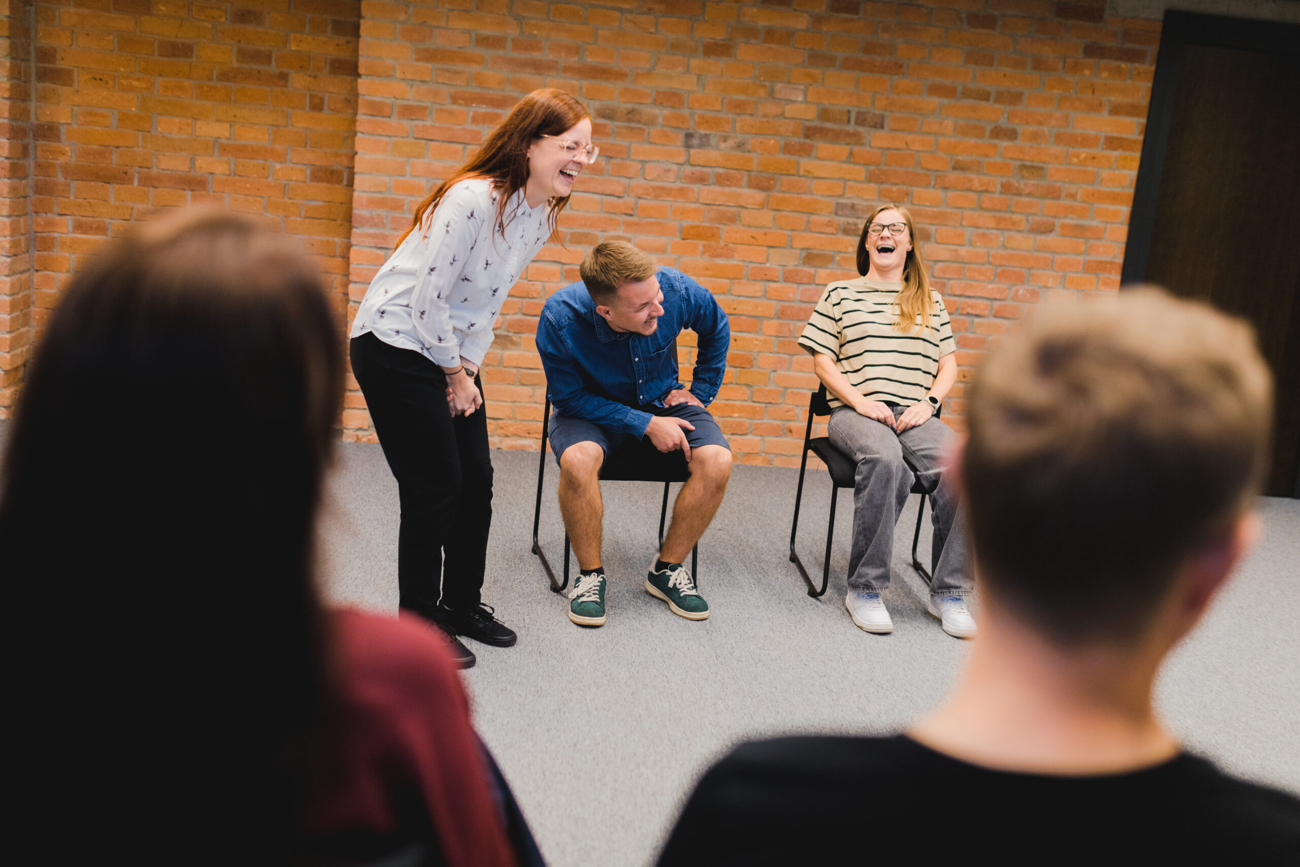 Kurs przeznaczony jest dla osób, które ukończyły nasz lvl 4 – Znajdujemy komedię lub w innej szkole nauczyły się podstaw improwizacji, ukończyły kurs grania scen dwójkowych, budowania wyrazistych postaci i podstaw narracji oraz znają mechanizmy komediowe.